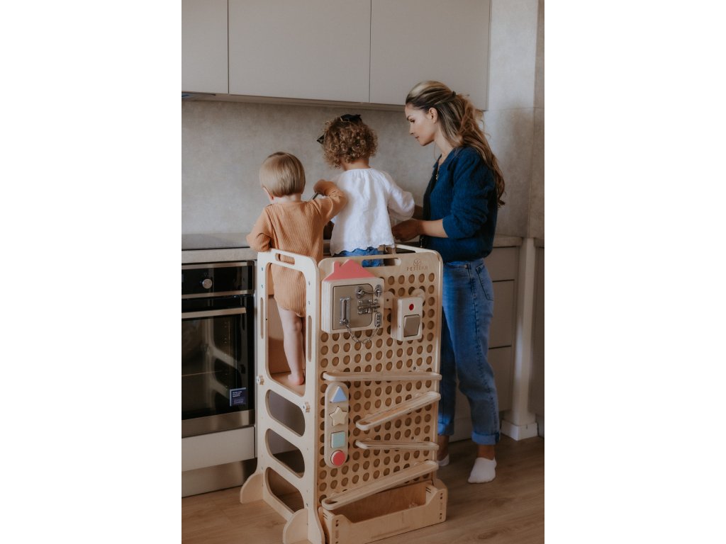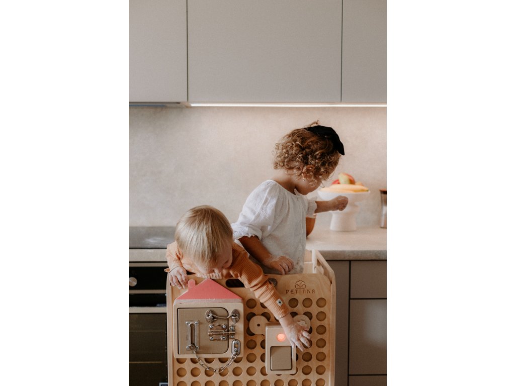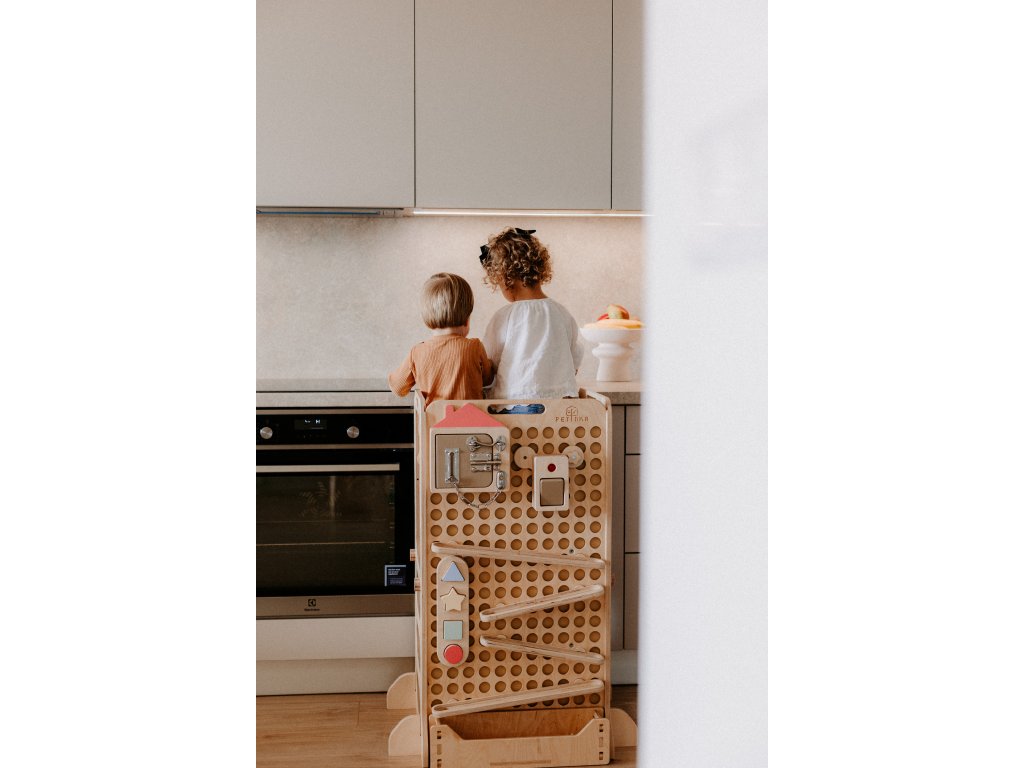 Základem je naše prémiová učící věž Petinka Premium – nejbezpečnější z našich věží, vybavená čtyřmi odnímatelnými bezpečnostními stěnami a zadní bezpečnostní tabulí. Je vhodná už pro děti, které se právě naučily samostatně stát (cca od 9 měsíců), a díky svému designu jim poskytuje stabilitu, bezpečí a možnost zapojit se do každodenních aktivit.